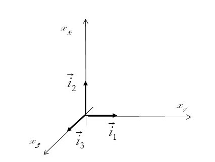 Dans tout ce qui suit, on aura au préalable défini un référentiel « fixe » (celui du laboratoire) muni d’un repère orthonormé \(\mathcal{R}\), avec une base de vecteurs \(\vec{i}_\alpha,\ \alpha=1..3\), les coordonnées sur les axes du repère sont nommées \(x_\alpha,\ \alpha=1..3\).