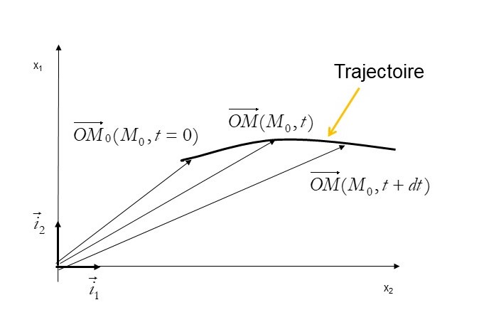 On peut définir alors, le vecteur position à l’instant t, \(\vec{OM}=\vec{OM}(X_{1,0},X_{2,0},X_{3,0},t)\) . Sur la trajectoire, la position ne dépend alors que de la position initiale (très importante!) et du temps.