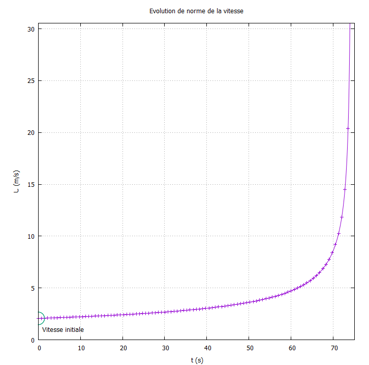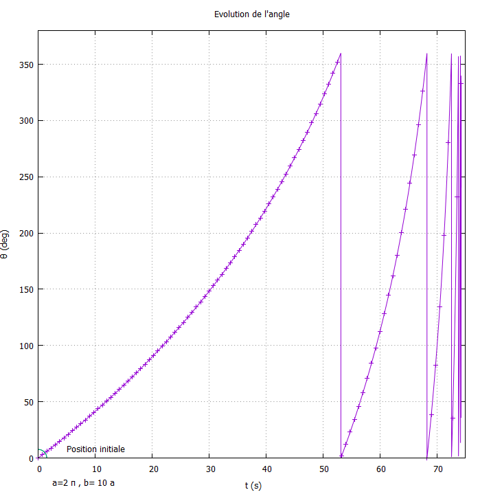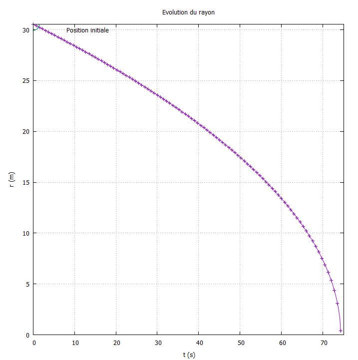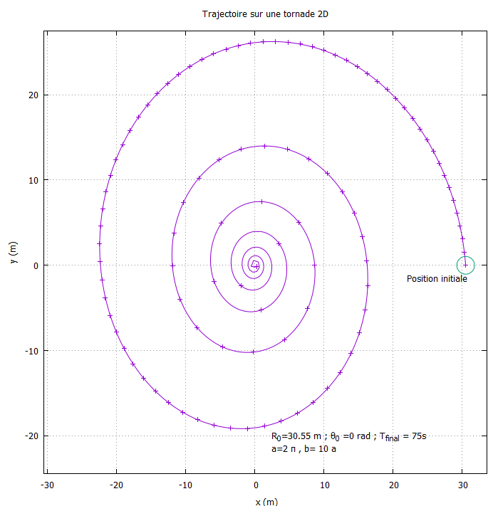 On prendra \(r_0 = 30.55m, \theta_0=0 rad\) \(t_{final}=75s\), \(a=2\pi\) et \(b=10a\)