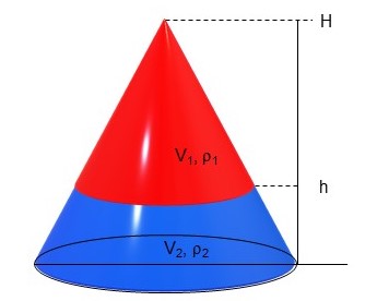 Soit un réservoir de forme conique (la base est de rayon R, la hauteur est H=0.6m) est rempli dans sa partie basse par de l’eau et au-dessus un fluide de masse volumique \(\rho_1 \). Calculer la hauteur h correspondant à l’interface entre l’eau et l’huile de telle façon que la masse des 2 fluides soient identiques.