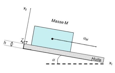Un objet de masse m=15kg, glisse sur un plan incliné de 10° par rapport à l’horizontale. De l’huile est constamment présente sur ce plan incliné ou du moins sous l’objet pour assurer son déplacement. L’aire A de sa surface en contact avec le fluide est A=1m \(2\). On suppose que l’huile est un fluide newtonien de viscosité dynamique constante \(\mu =10^{-3} Pa.s\). L’épaisseur de la couche de fluide est h=2mm.