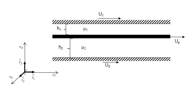 2 fluides différents s’écoulement entre ces plaques, de viscosité dynamique \(\mu_1 \)mu_2`, telle que \(\frac{\mu_1}{\mu_2}=2.5\) et \(\frac{h_1}{h_2}=\sqrt 2\). On suppose que les hauteurs \(h_1\) et \(h_2\) sont assez faibles et sont dans la couche limite des écoulements.