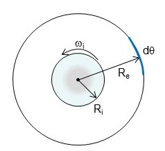 On considère un viscosimètre de Couette constitué de 2 cylindres coaxiaux de hauteur h=0.1m qui contient un fluide de viscosité dynamique \(\mu =0.08 Pa.s\). Le cylindre intérieur de rayon \(R_i = 40 mm\) tourne avec une vitesse \(\omega_i =200 tr/mn\). Le cylindre extérieur de rayon \(R_e = 43 mm\) est maintenu immobile. Calculer la force élémentaire exercée par le fluide sur un élément de surface du cylindre extérieur. En déduire la contrainte totale exercée par le fluide sur ce cylindre et donc le couple à appliquer pour faire tourner le cylindre intérieur. On supposera une forme linéaire de la vitesse entre les 2 plaques.