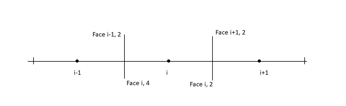 Let’s consider here 1D mesh with the characteristics of the one depicted in Figure 2.4. For the cell i, the face cell number 2 is between cell i and i+1, the face cell number 4 is between cell i and i-1. The fluxes must obey the property established in Chapter 1 and given by Eq.1.5.