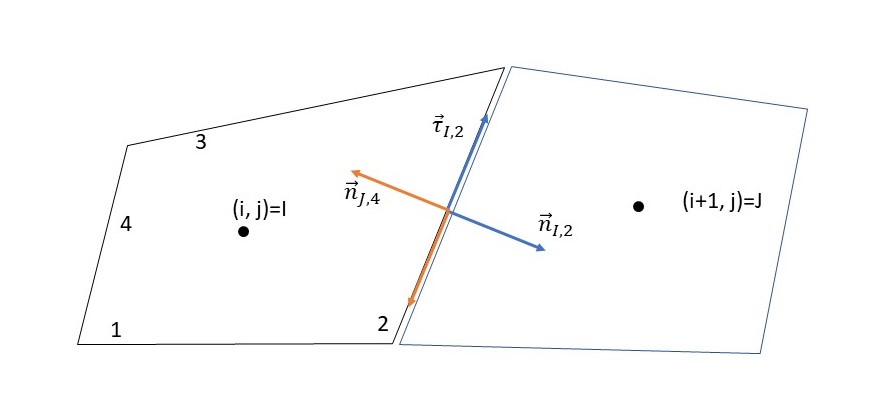 A scalar flux is managed the same way as given by Eq.4.1 whatever the space dimension. Vectorial fluxes required more attention because of projection in 2 local frames. Let’s consider the cell loacted at (i,j)=I and its neighbour (i+1,j)=J. Then according to Figure 2.3 the common face is the face number 2 for cell I and 4 for cell J as depicted in the Figure Figure 4.2.